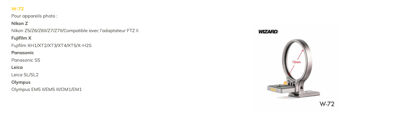 W-72 : Nikon Série Z, Fujifilm Série X, Leica Série SL, Olympus/OM et Panasonic