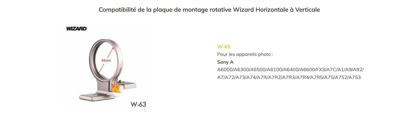 Le diamètre extérieur de l’attache d’objectif doit être inférieur au diamètre intérieur du Plateau à Rotation Rapide NiSi Wizard. Le diamètre intérieur du Wizard W-63 est de 63mm – les objectifs dont le diamètre extérieur est supérieur à 63 mm ne peuvent pas être montés et peuvent nécessiter le W-72. Pour vérifier la compatibilité de l’objectif, mesurez le tour de l’objectif près de l’attache pour vous assurer qu’il est inférieur à 63mm.