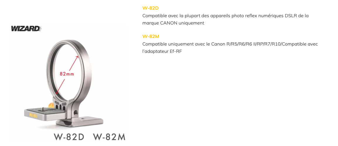 Le diamètre extérieur de l’attache de l’objectif doit être inférieur au diamètre intérieur du Plateau à Rotation Rapide NiSi Wizard. Le diamètre intérieur du NiSi Wizard W-82M est de 82mm – il n’est pas possible de monter des objectifs dont le diamètre extérieur de l’objectif est supérieur à 82mm. Pour vérifier la compatibilité de l’objectif, mesurez le tour de l’objectif près de l’attache pour vous assurer qu’il est inférieur à 82mm.