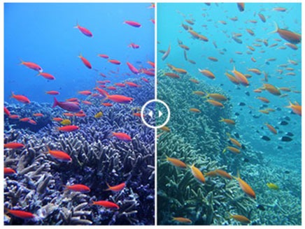 La balance des blancs est optimisée pour supprimer les teintes bleues et obtenir des couleurs naturelles sous l’eau. Le mode Vidéo sous-marine applique cet effet en filmant des vidéos 4K.