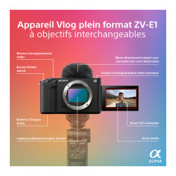 Découvrez le SONY ZV-E1, un appareil photo hybride offrant une qualité vidéo 4K 60 images/s grâce au processeur BIONZ XR et capteur CMOS 12,1 Mpx. Une mise à jour en juin permettra la vidéo 4K à 120 images/s et 1080p à 240 images/s. L'autofocus précis détecte divers sujets grâce à une puce IA dédiée. Le microphone amélioré capte le son en provenance de l'avant ou de l'arrière. L'ergonomie inclut un commutateur entre modes photo, vidéo et S&Q, un bouton zoom motorisé et un écran pivotable. Profitez des fonctionnalités phares de la gamme ZV avec le Sony ZV-E1.