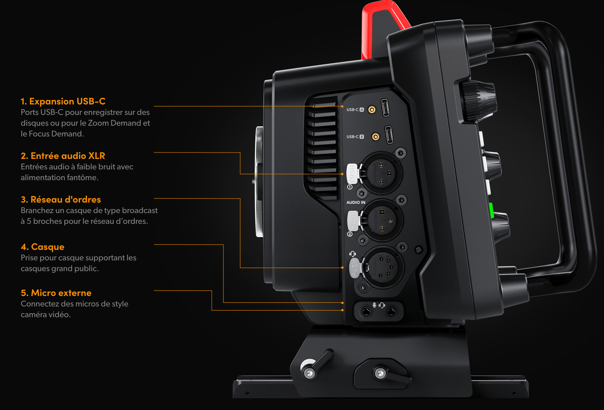 Entrée/sortie audio : 2 x entrées XLR 3 broches mic/line (+48 V d'alimentation fantôme) sur le boîtier de la caméra, 1 x entrée microphone stéréo TRS 1/8" / 3,5 mm, 1 x entrée/sortie casque/microphone TRRS 1/8" / 3,5 mm, 1 x entrée/sortie interphone XLR 5 broches