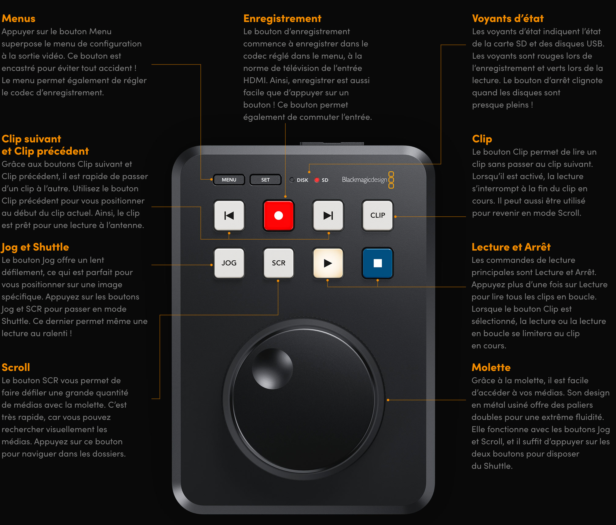 L’HyperDeck Shuttle HD est un enregistreur et un lecteur conçu pour être utilisé sur un bureau ! Il peut donc faire à la fois office d’enregistreur de masters et de lecteur de clips. Sa grande molette est parfaite pour faire défiler les médias et trouver le clip que vous souhaitez lire. Ses connexions HDMI permettent de relier des mélangeurs, des caméras et des moniteurs. L’appareil intègre même un prompteur.