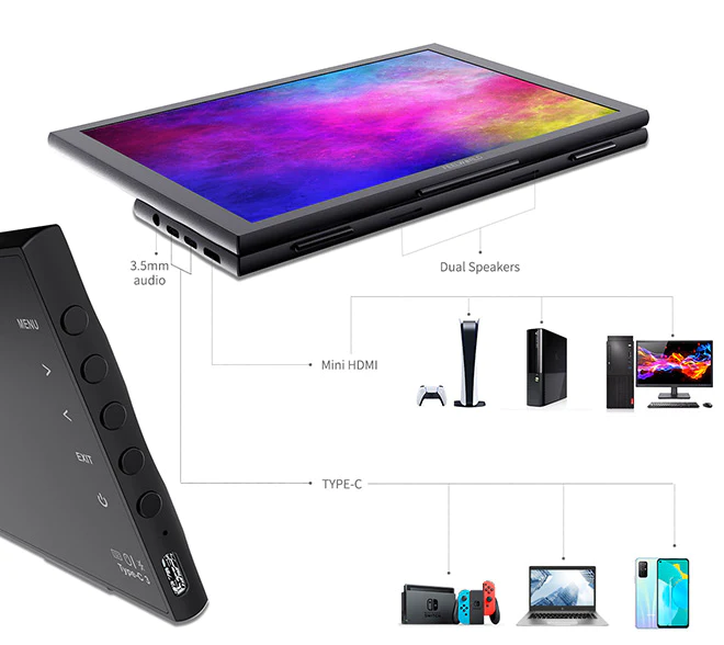 Le moniteur est composé d'un panneau mince et le poids de l'ensemble du moniteur n'est que de 650 g (1.43 lb), il est très adapté aux voyages, aux affaires, aux jeux à l'extérieur et partout où vous souhaitez utiliser un moniteur externe, mettez-le dans votre sac à dos et aller.