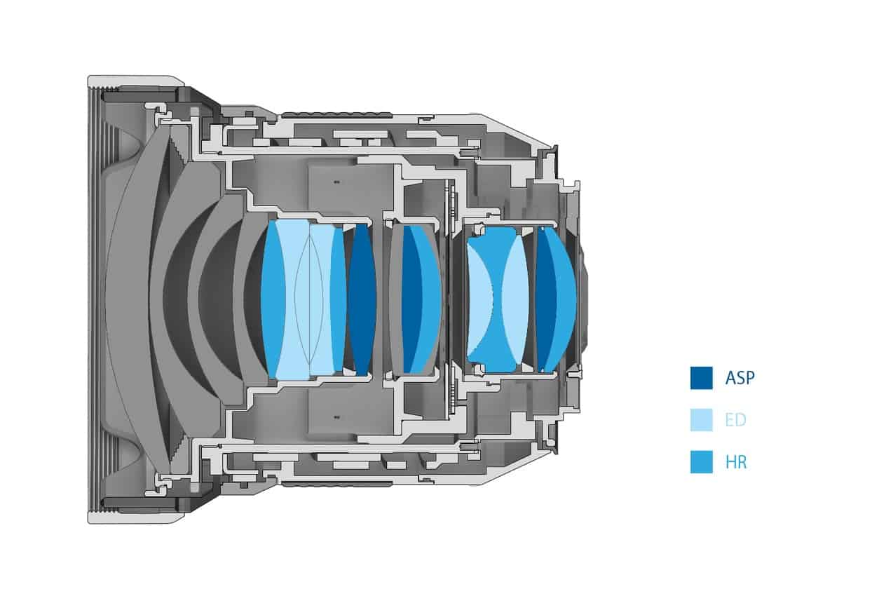 Il y a un total de 15 éléments dans 11 blocs optiques. L'objectif est conçu pour fonctionner avec les capteurs 35 mm plein cadre de dernière génération, c'est-à-dire avec une haute résolution.