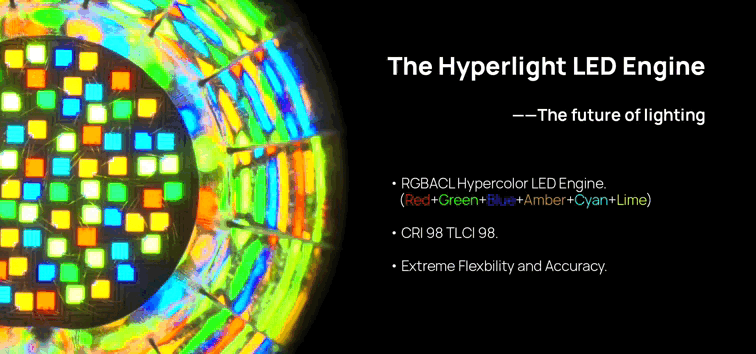 En fait, le moteur de couleur Hyperlight est si puissant qu'il est même capable de créer de nouveaux spectres de lumière jamais vus auparavant dans l'éclairage de cinéma, qui ont des applications techniques ou créatives spécifiques.