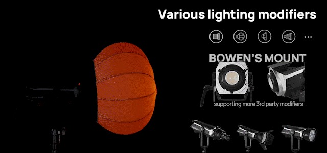 L'Orion 300 FS utilise l'omniprésente monture de réflecteur de type Bowens et Prolycht propose une gamme complète de modificateurs, dont une lentille de Fresnel 2x, une lentille de projection avec gobos, une boîte à lumière à dôme, un diffuseur, une lanterne, un coupe-flux et un réflecteur.