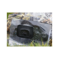 À l'arrière de la housse, il y a une grande fenêtre en plastique souple et transparent qui permet de voir l'écran arrière de votre appareil photo ainsi que les différentes commandes. Toutes les commandes de l'appareil photo peuvent être utilisées à travers la housse et la fenêtre transparente, car elles sont suffisamment souples pour cela. Nos housses anti-pluie sont dotées d'une casquette qui se fixe à l'avant du pare-soleil pour empêcher les gouttes d'eau de pénétrer à l'intérieur et d'éclabousser la lentille frontale. Cette casquette peut également être utile pour réduire les reflets dans certaines situations de contre-jour. Enfin, la housse est livrée avec une pochette de rangement pratique pour ranger la housse mouillée dans votre sac photo.
